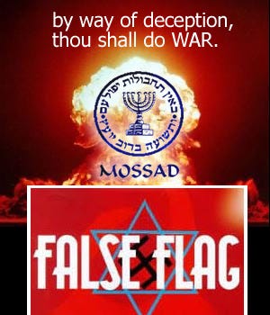False flag operations are often linked to neo-colonial agendas (Mossad), e.g. include the 9/11 attacks, 1946 King David Hotel bombing, 1967 USS Liberty attack, and the JFK, among others.